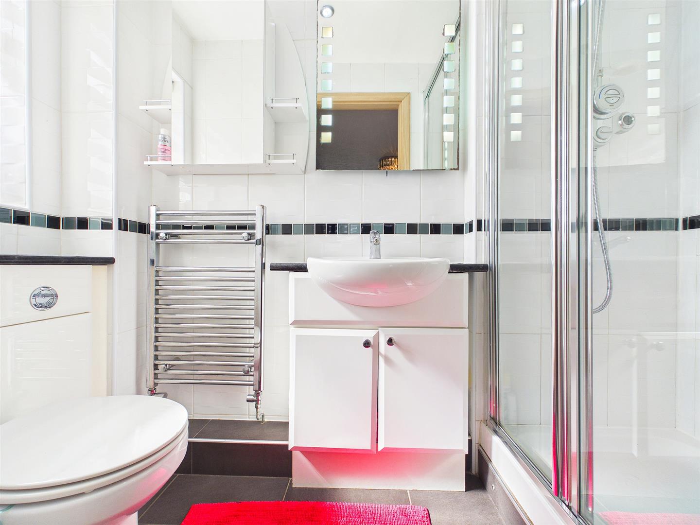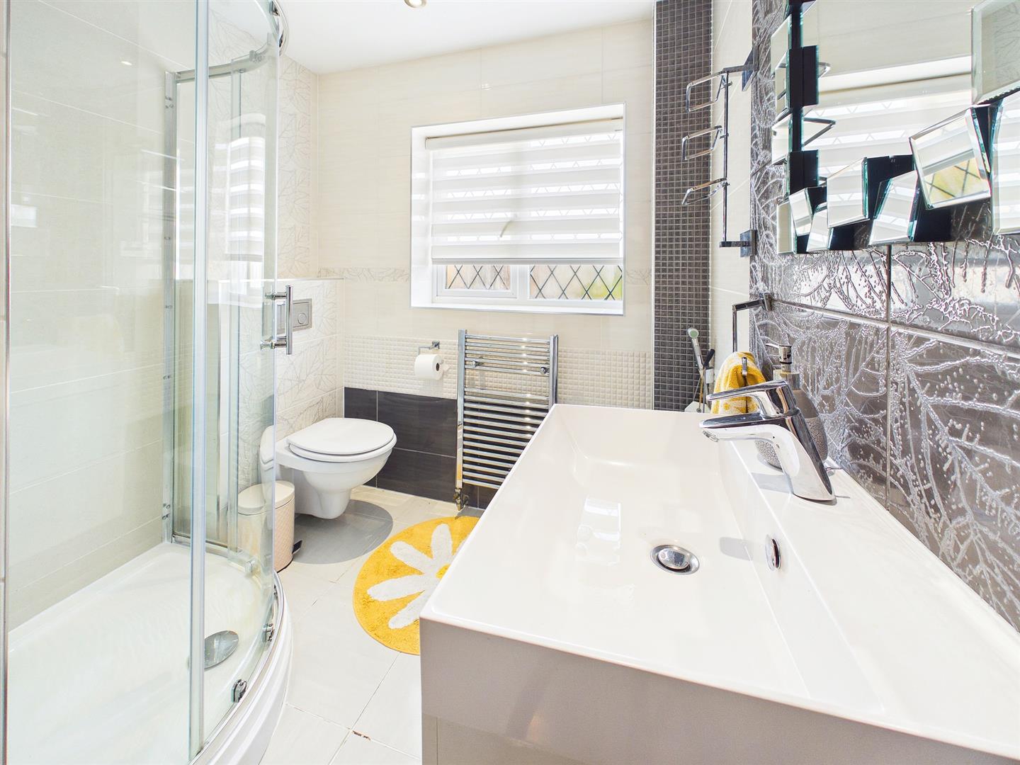 Comprising a modern contemporary three-piece suite to include double width walk-in shower cubicle with tile surround and mains fed shower unit, wash hand basin inset to vanity unit with mixer tap and low-level WC. Heated towel rail. Tiled floor and fully tiled walls. Frosted window to the side elevation.