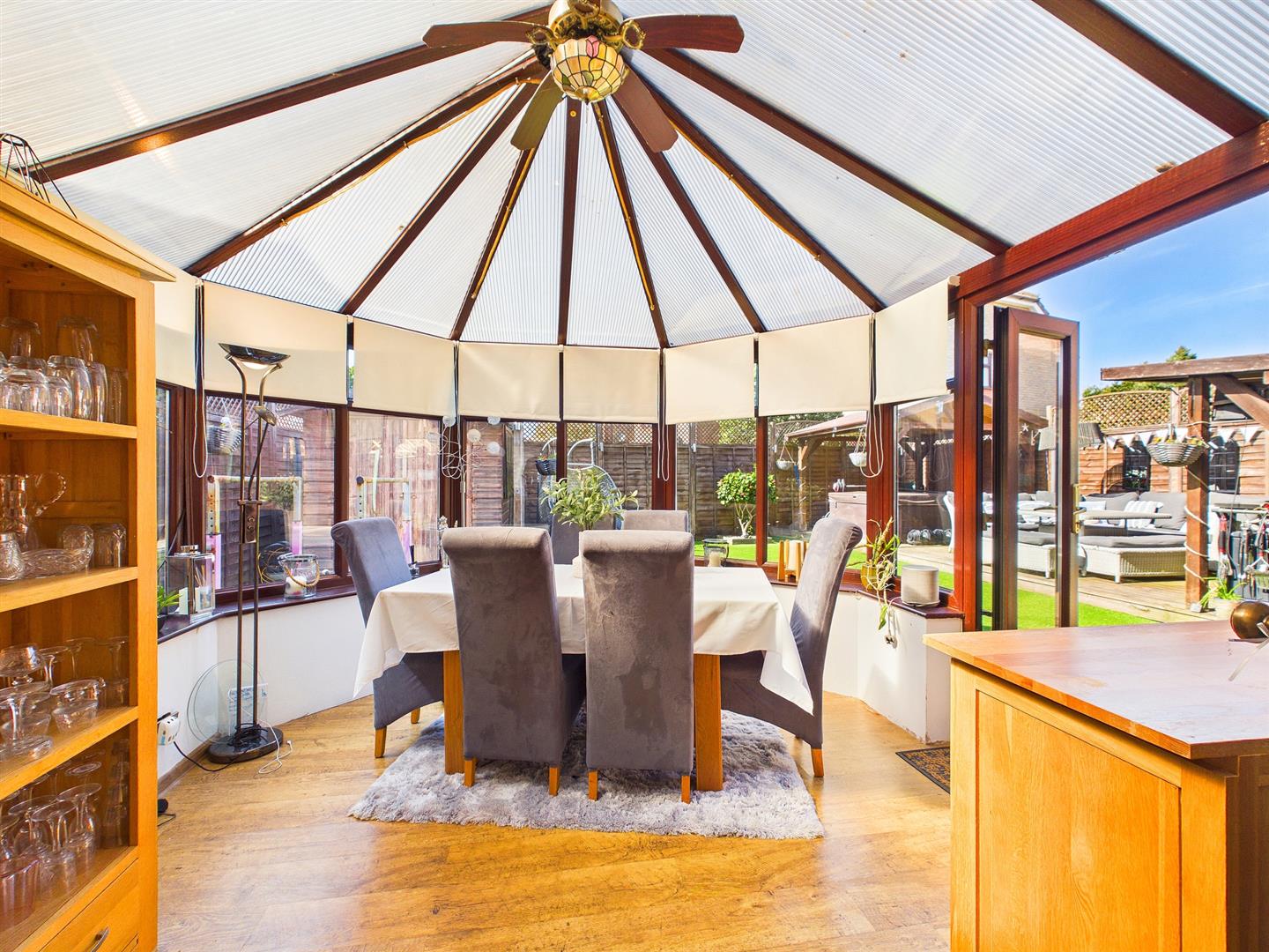 A versatile room currently utilised as a formal dining space. Fully double glazed with French doors directly out to the rear garden. Wood effect laminate floor.