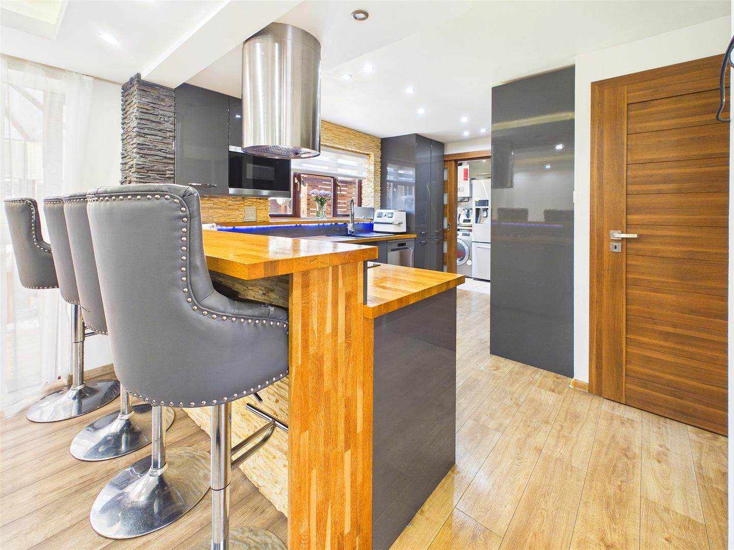 A further range of fitted units with wooden worktop and tile splashback. Space for American style fridge/freezer and space for under counter white goods. Housing the Glow-Worm gas combi boiler. Tiled floor. Access out to rear garden.