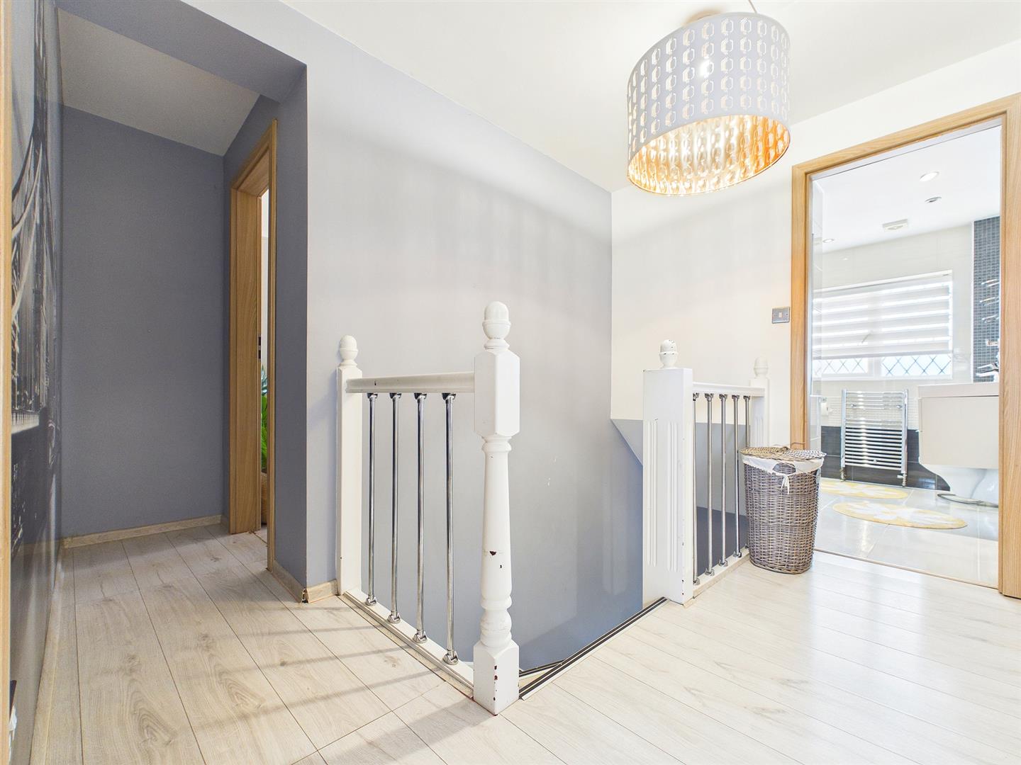 A spacious landing area with access to loft space and wood effect laminate flooring.