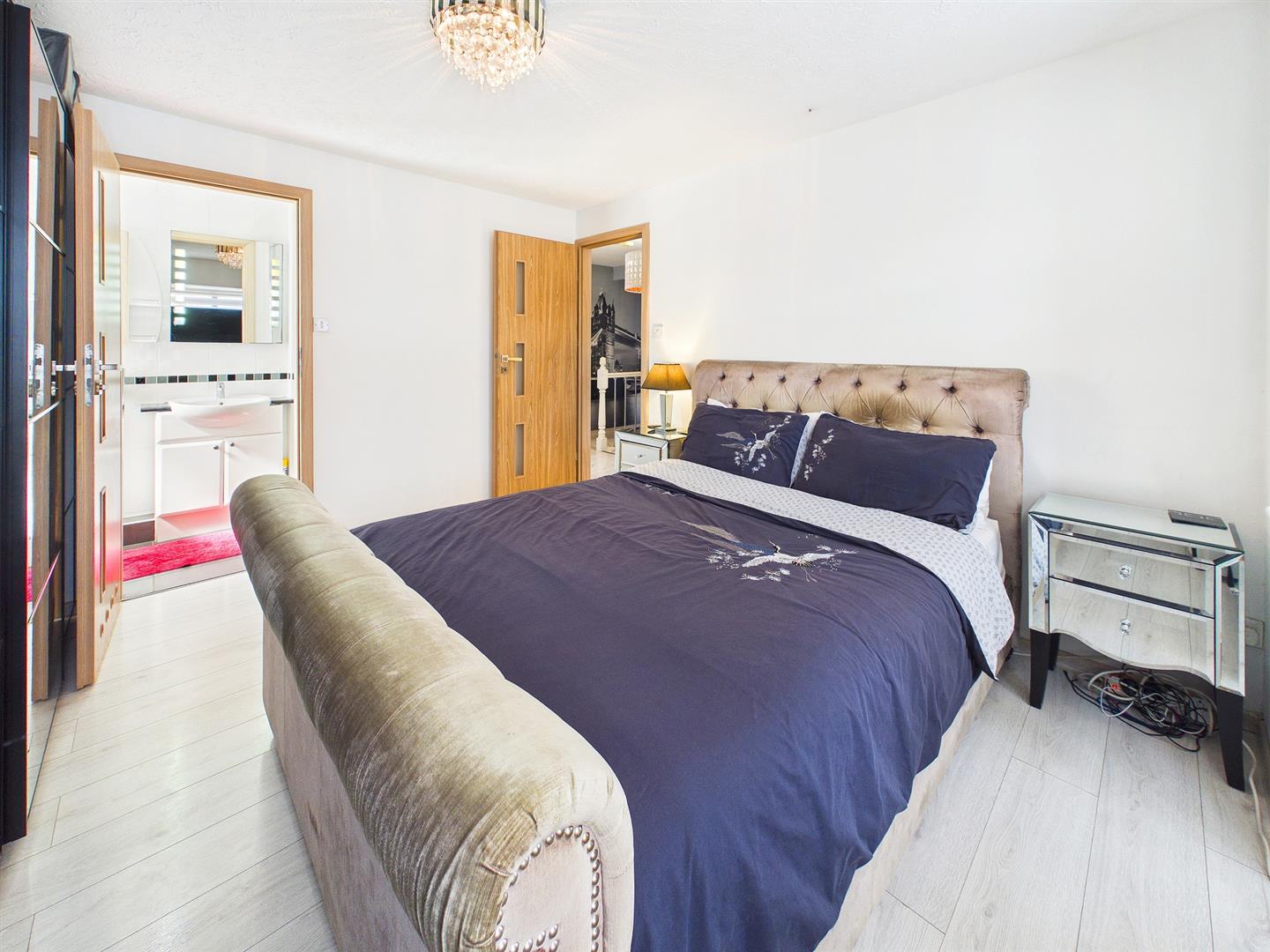 A sizeable principal bedroom with bay window to the front elevation and wood effect laminate floor. Door to:-