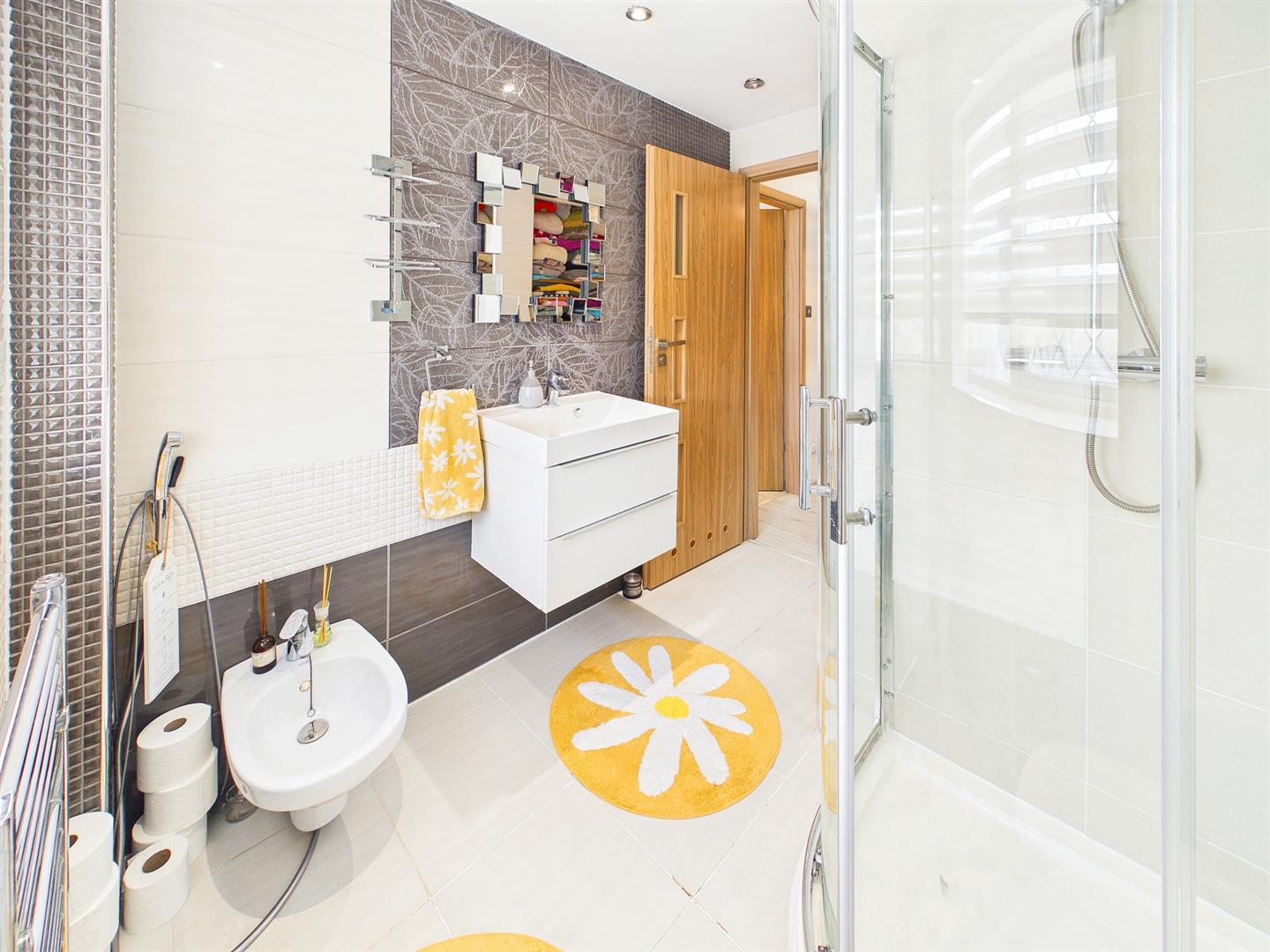 Comprises a quality contemporary suite to include large corner walk-in shower cubicle with overhead waterfall shower and handheld shower attachment, low-level WC, bidet with mixer tap and wall-mounted wash hand basin with mixer tap. Attractive wall tiling and tiled floor. Frosted window to the front elevation.