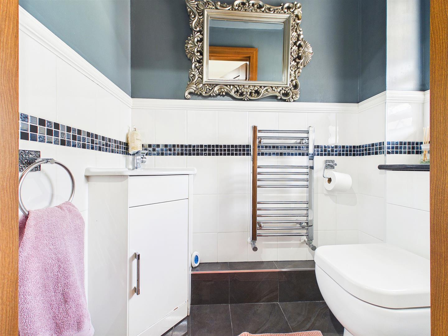 A modern neutral suite to include low-level WC and wash hand basin inset to corner vanity unit with mixer tap. Heated towel rail. Feature half-tiled walls and tiled floor. Frosted window to the front elevation.