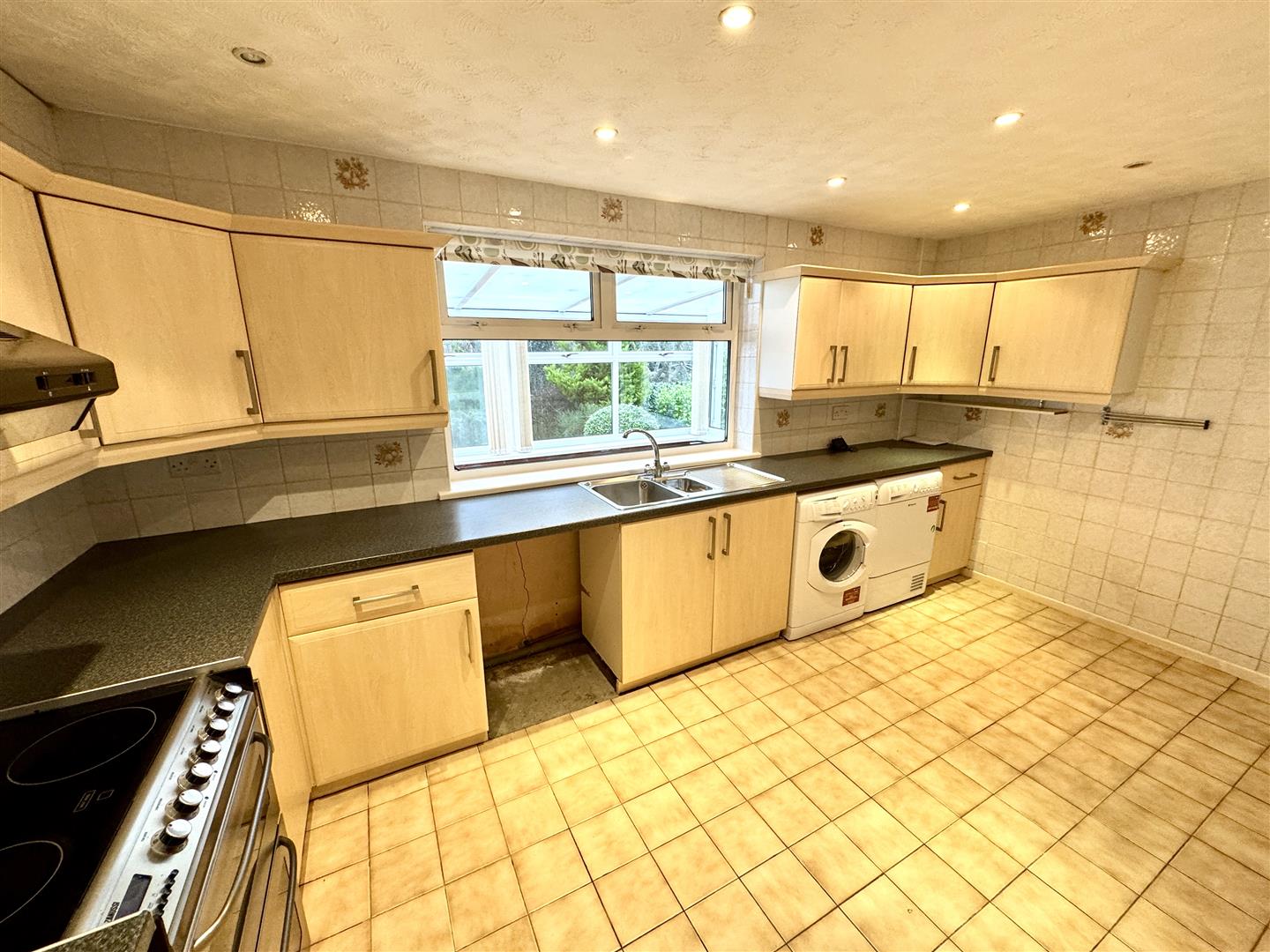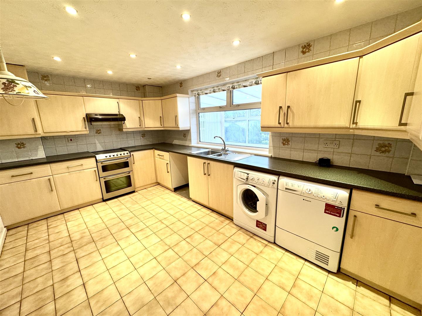 A spacious kitchen appointed with a matching range of base and eye level storage units with ample work surfacing over and tiled walls. One and a half bowl and drainer stainless steel sink unit with mixer tap. Freestanding cooker with extractor over. Space for dishwasher, washing machine and tumble dryer (to remain). Tiled flooring. Window to rear.