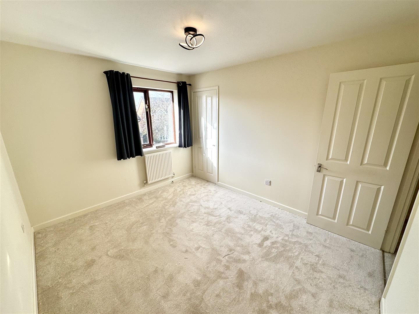 A spacious double bedroom with window to front elevation and a large built-in storage cupboard with inset shelving and a hanging rail.