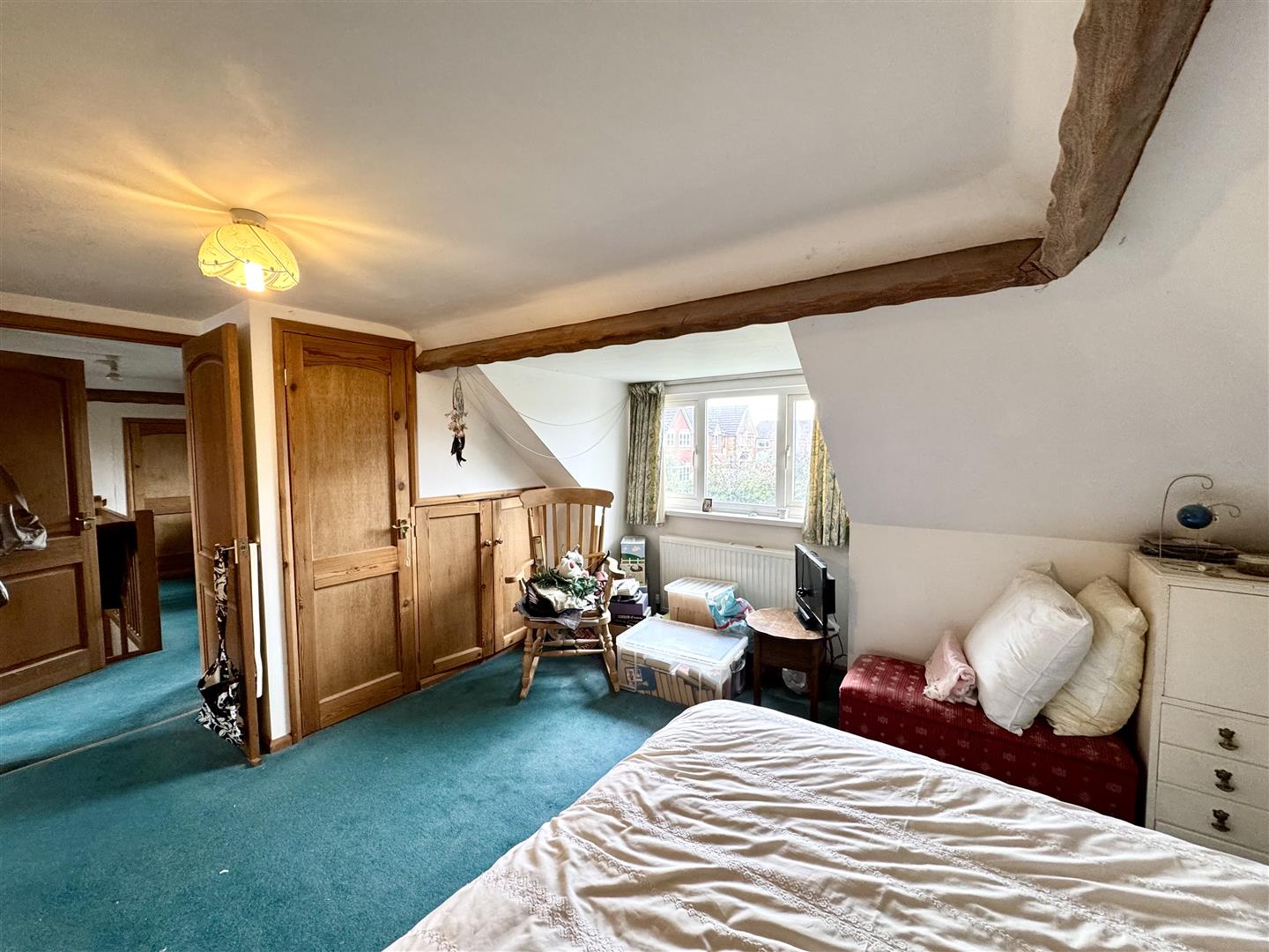 A spacious double bedroom with built-in storage and access to eaves storage. Window to front elevation. Door to:-