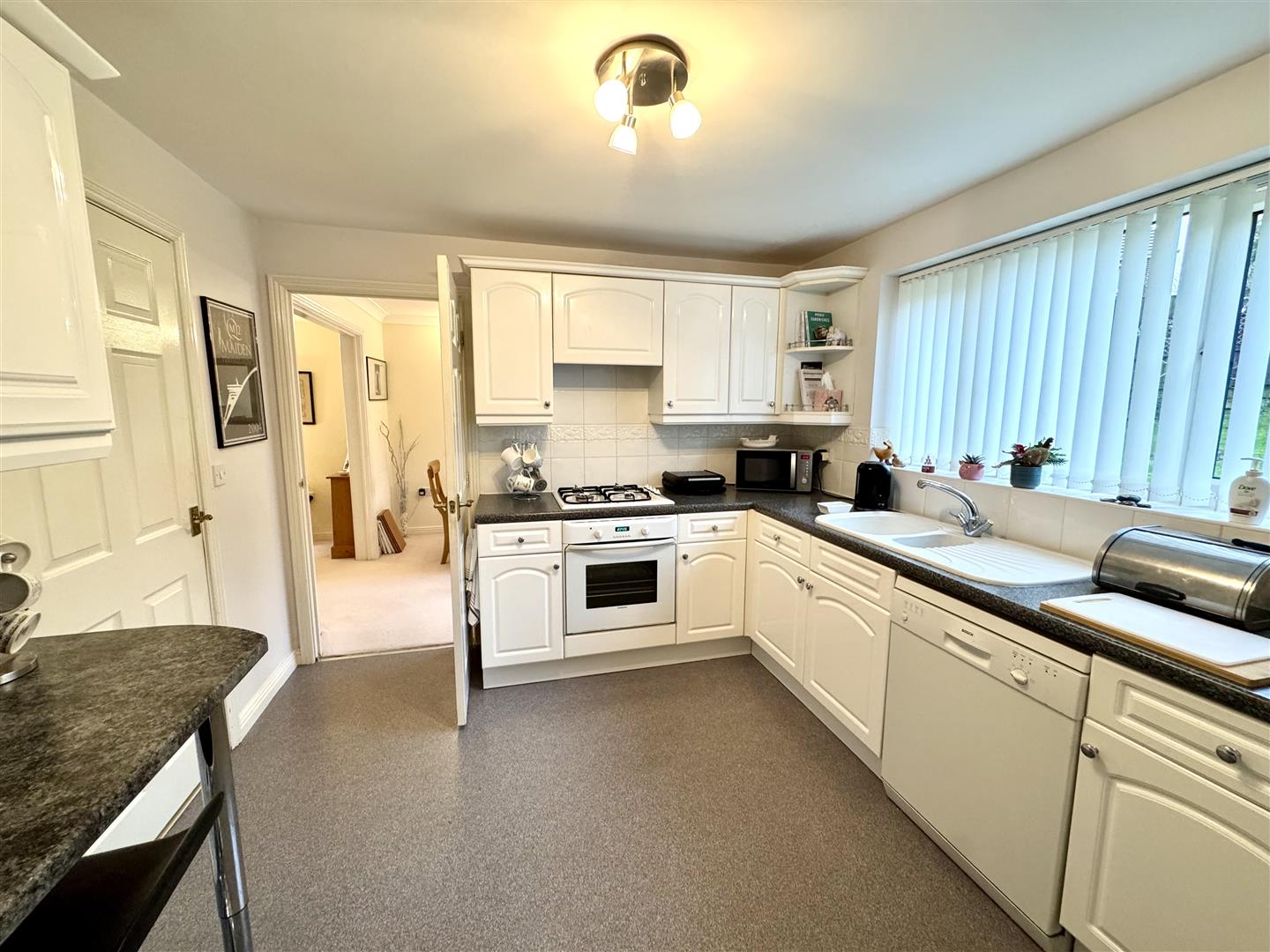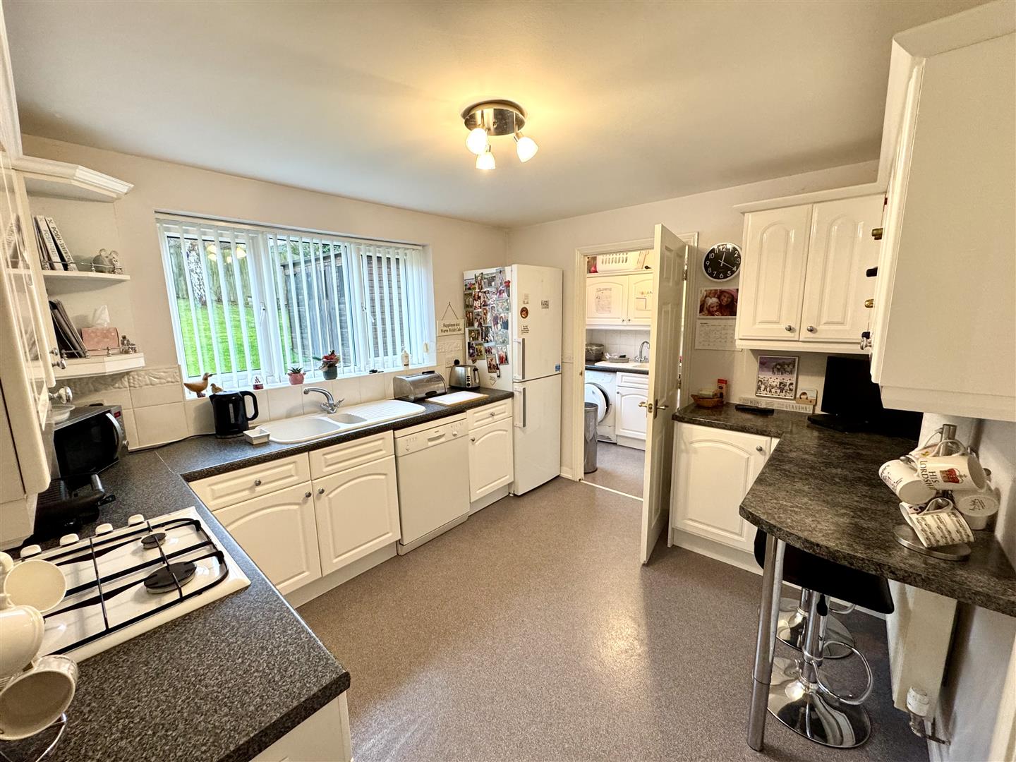 Appointed with an extensive range of fitted wall and base units with ample laminate worktop over and tiled splashbacks, along with breakfast bar. Inset one and a half bowl sink with drainer. Integrated four ring gas hob with concealed extractor hood over and electric oven/grill below. Space and plumbing for dishwasher and space for a full height free standing fridge/freezer. Window to the rear elevation enjoying views across the gardens. Door to:-