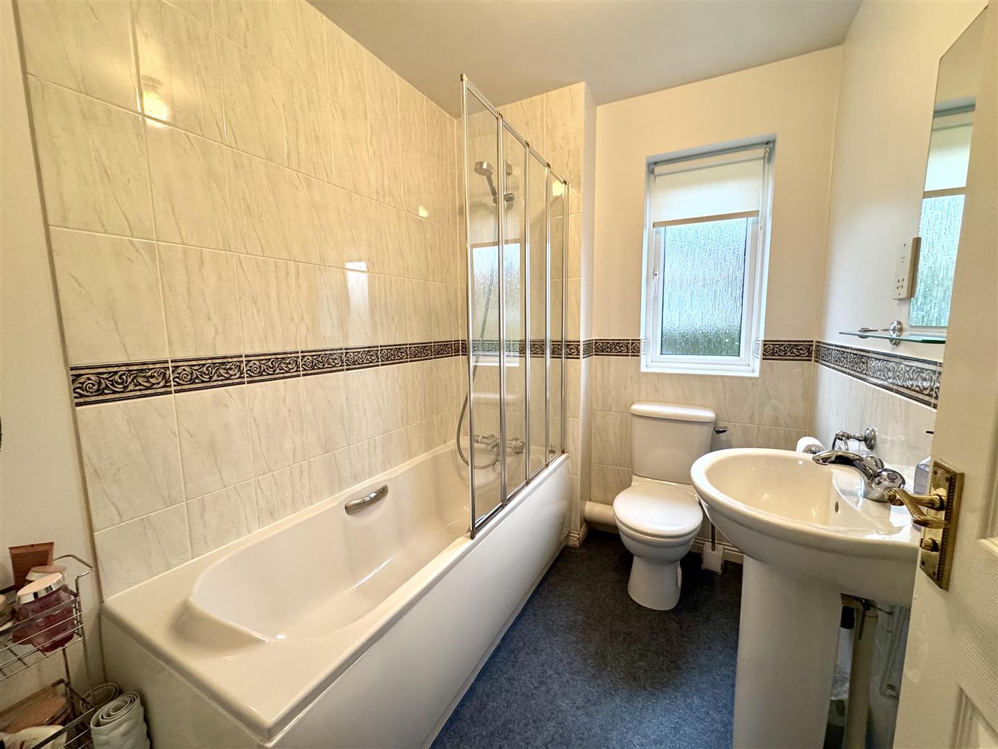 Comprising a three piece suite to include panelled bath with mains fed shower unit over, tiled surround and glass shower screen, low-level WC and pedestal wash hand basin. Half-tiled walls. Frosted window to rear elevation.