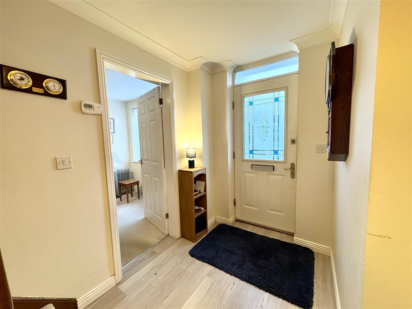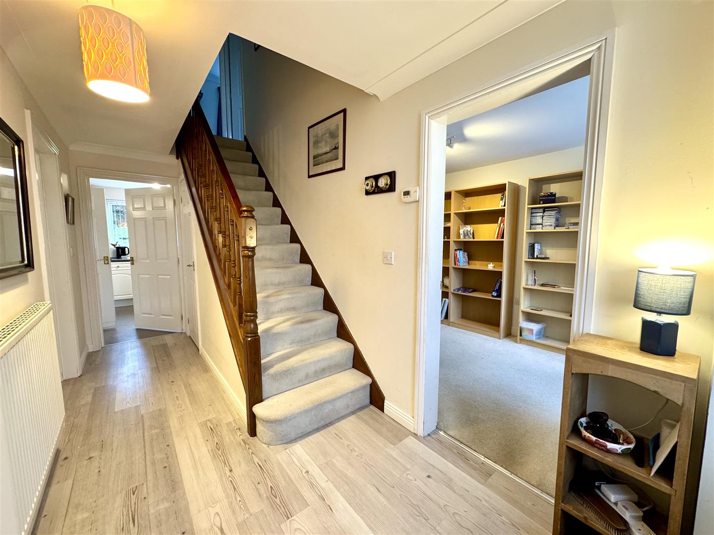 Welcoming reception hall with half-glazed front door. Stairs to the first floor with feature wooden balustrade and a useful built-in understairs storage cupboard. Wood effect laminate flooring.