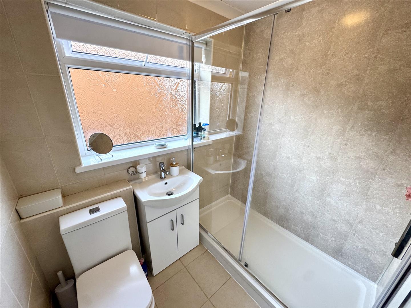 A contemporary modern suite to include double width walk-in shower cubicle with PVC surround and mains fed shower unit to include waterfall shower head and separate handheld attachment, wash hand basin with mixer tap inset to vanity unit, and low-level WC. Wall-mounted chrome heated towel rail. Part-tiled walls and tiled floor. Frosted window to the side elevation.